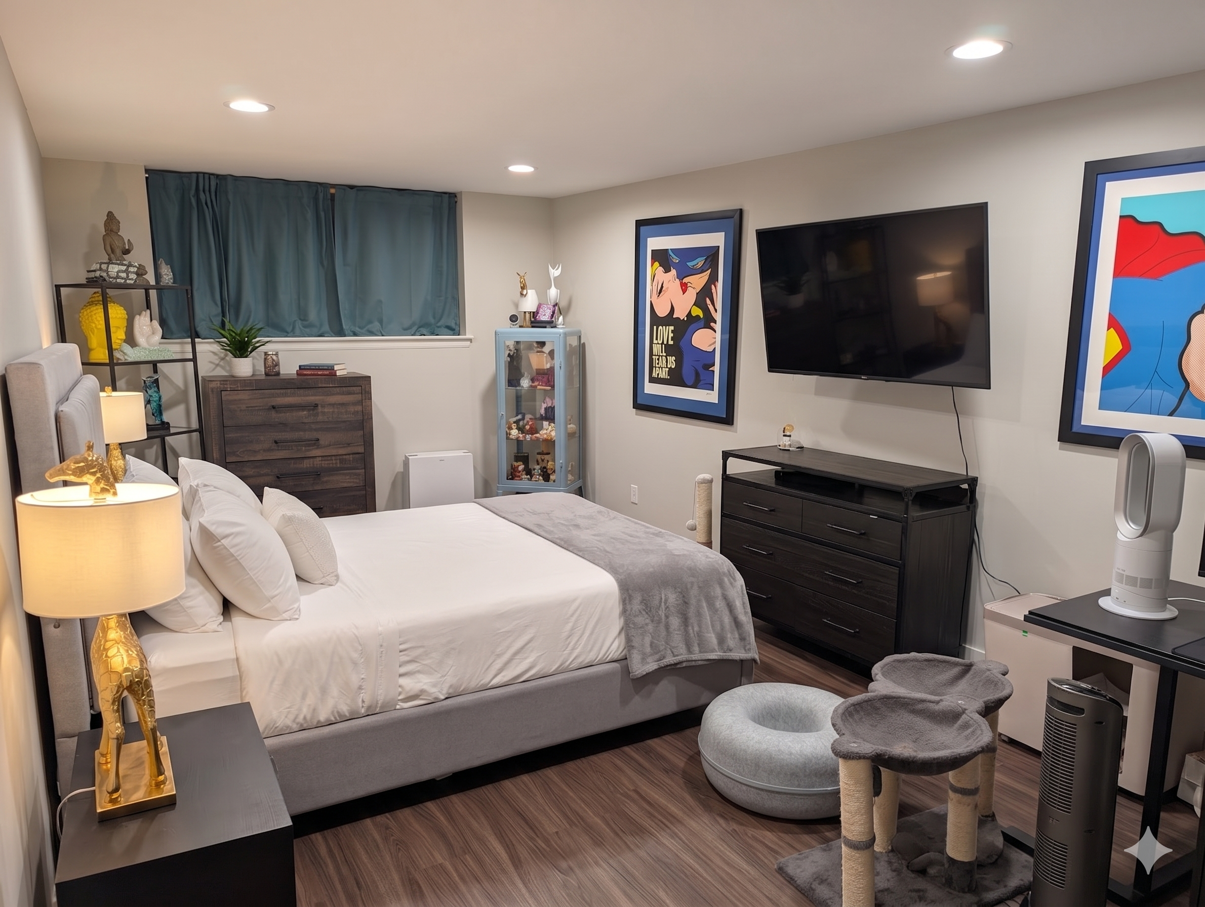 Extra-large bedroom with space for a king-size bed plus room for a desk, dresser, and more