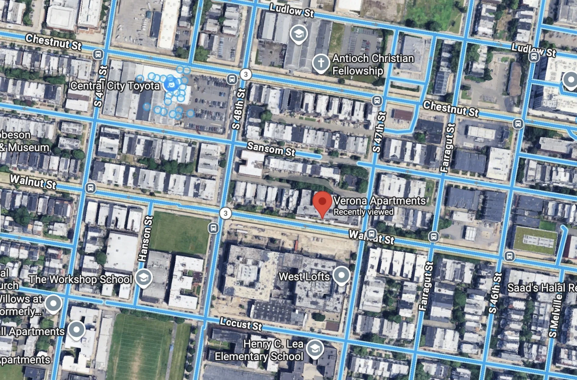 Located at 47th & Walnut in The Verona, across from the West Lofts (Old West Philly High).